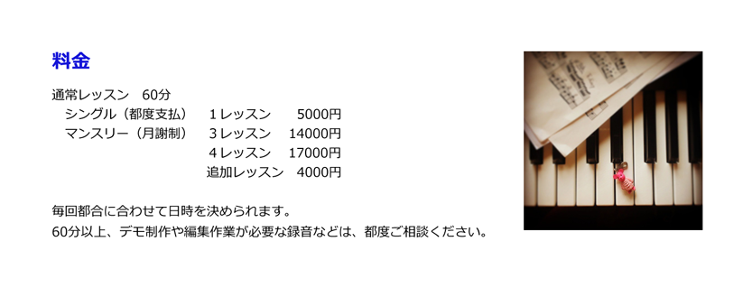 料金 通常レッスン 60分 4000円 10:00〜20:00 毎回都合に合わせて日時を決められます。まとめて予約をとることも出来ます。 60分以上、デモ制作など編集作業が必要な録音は、都度ご相談ください。